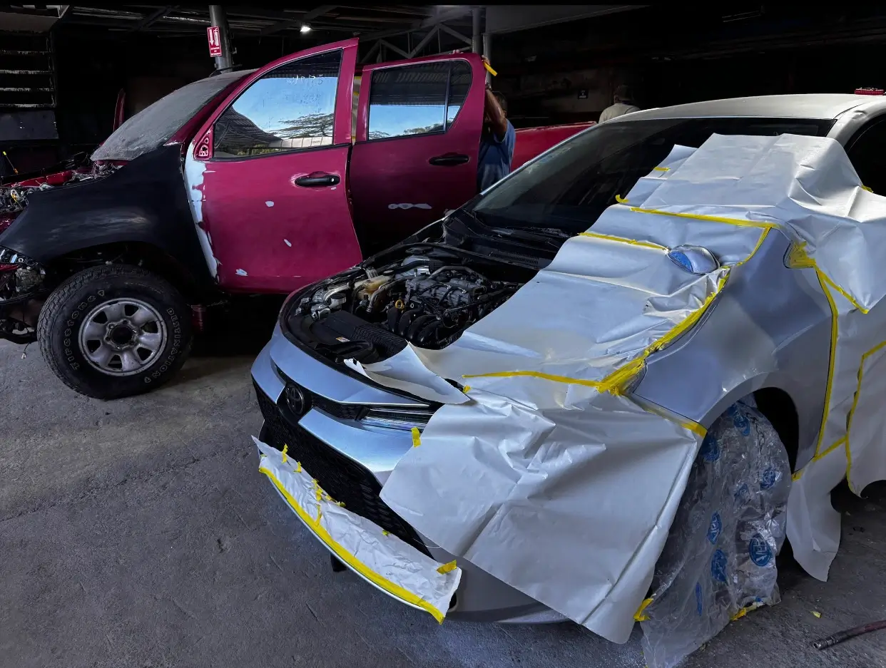 Restauración de carrocería con cabina de pintura profesional. Enderezado de golpes, hojalatería, preparación de superficie y aplicación de pintura con acabado de agencia.