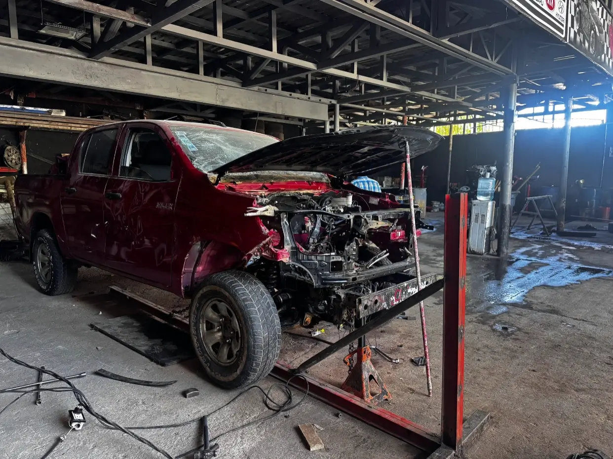 Restauración de carrocería con cabina de pintura profesional. Enderezado de golpes, hojalatería, preparación de superficie y aplicación de pintura con acabado de agencia.